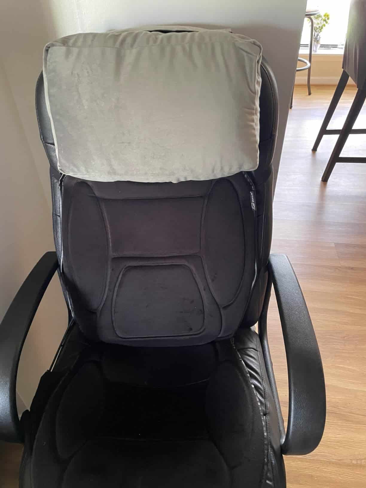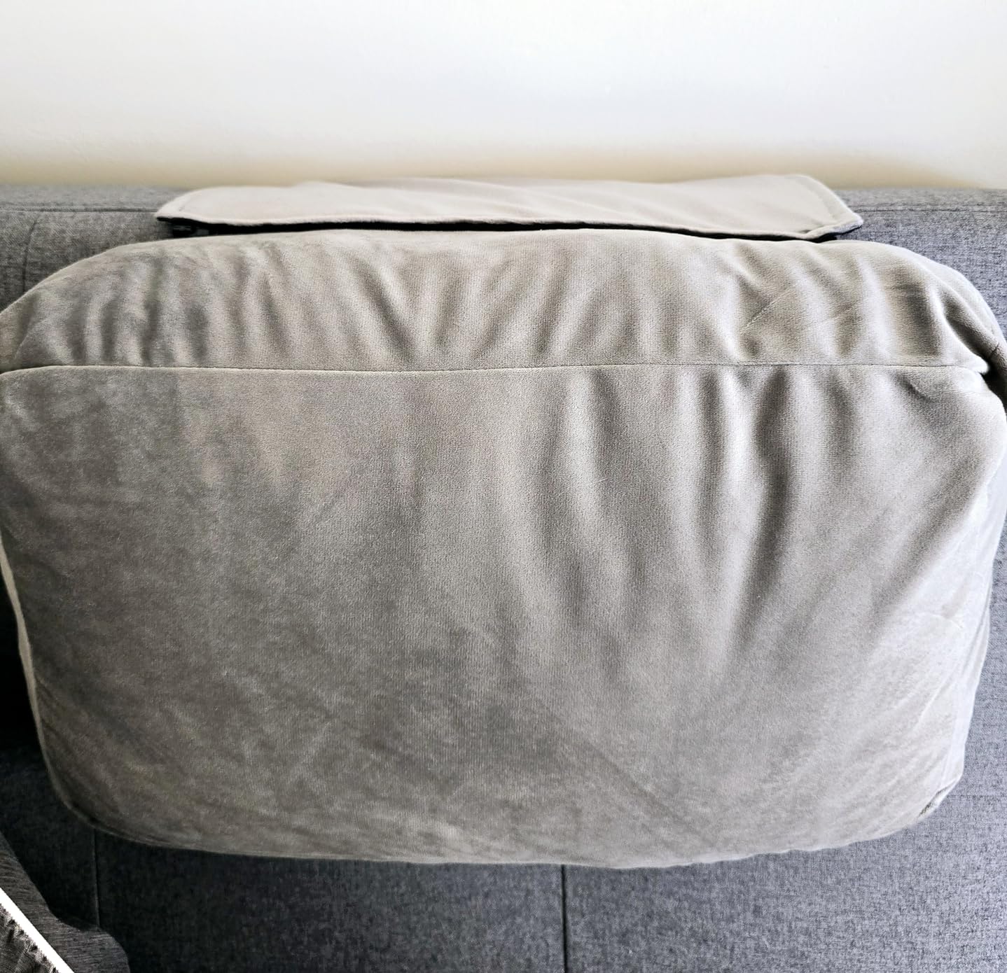 I got a sofa bed that while still in sofa mode can recline to an angle that’s much better for viewing TV. However, when angled back, my head has to lean back just a bit too far, so this pillow would have been perfect. I have included my own photos to show you real life impressions of how it actually looks like.
